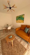 Living-comedor con mesa, sillas, sillón, mesita ratona, cuadros y mueble con TV y puertos USB de carga