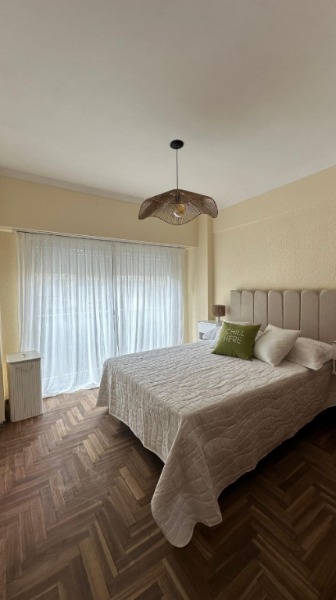 🛌 Dormitorio principal a la calle, con balcón francés, pisos de parquet lustrado y plastificado, amplio placard con baulera. Equipado con cama de 2 plazas, mesas de luz y ropa de cama